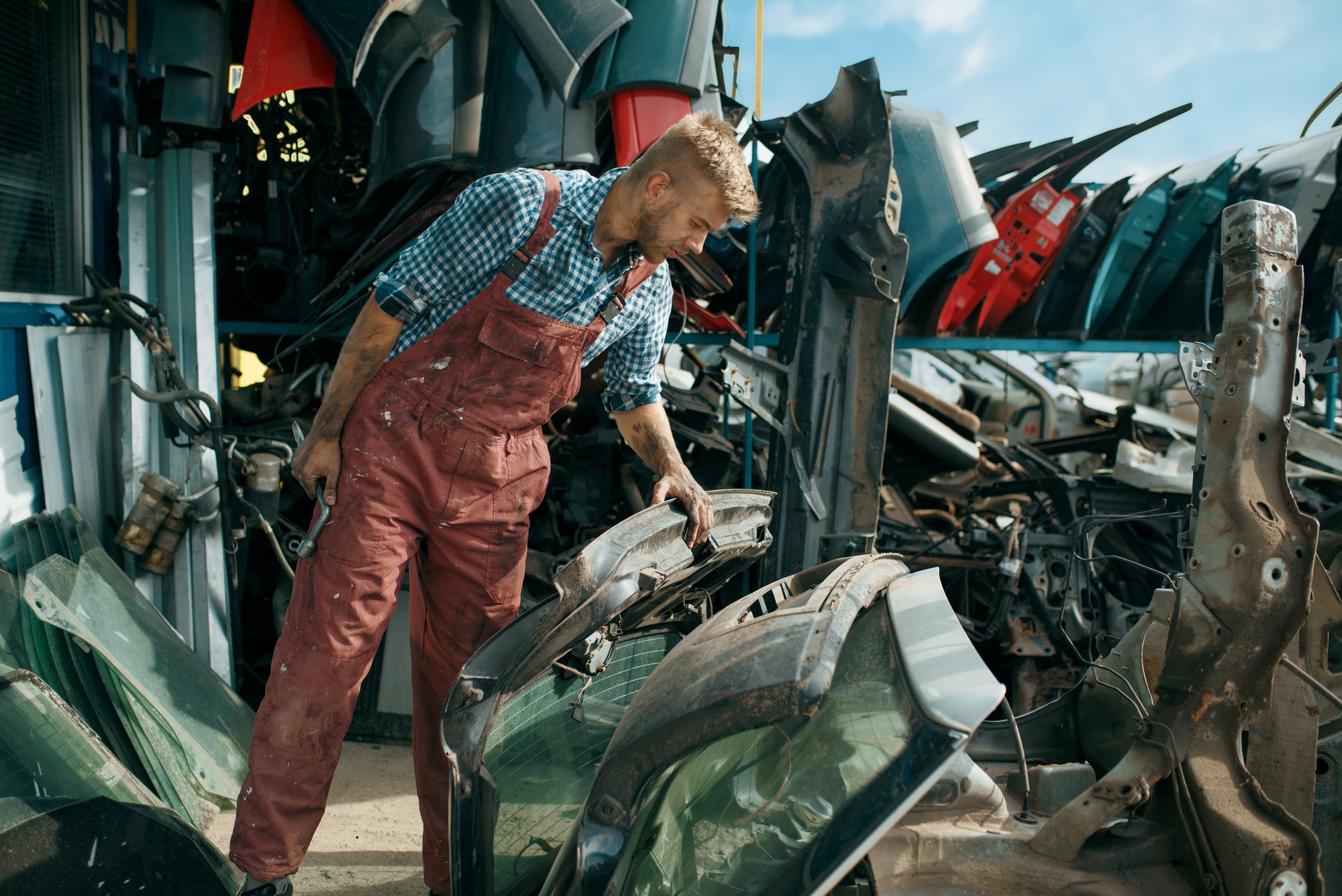 Male repairman choosing spare parts on car junkyard